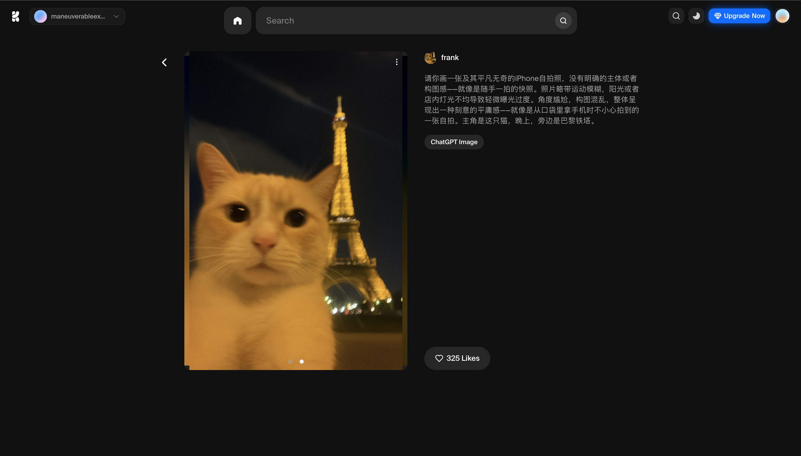 Промпт: Draw an extremely ordinary and unremarkable iPhone selfie, with no clear subject or sense of composition — like a casual snapshot taken without thinking. The photo should have slight motion blur, with sunlight or indoor lighting unevenly causing mild overexposure. The angle is awkward, the framing is messy, and the overall result feels deliberately mediocre — as if it were accidentally taken while pulling the phone out of a pocket.The main subject is this cat, at night, with the Eiffel Tower next to it.